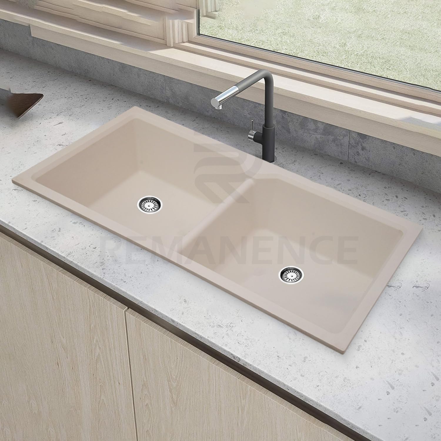 REMANENCE Granite Quartz Double Bowl Kitchen Sink With Drain Board (45 x 20 x 9 Inch) (Snow Sand)