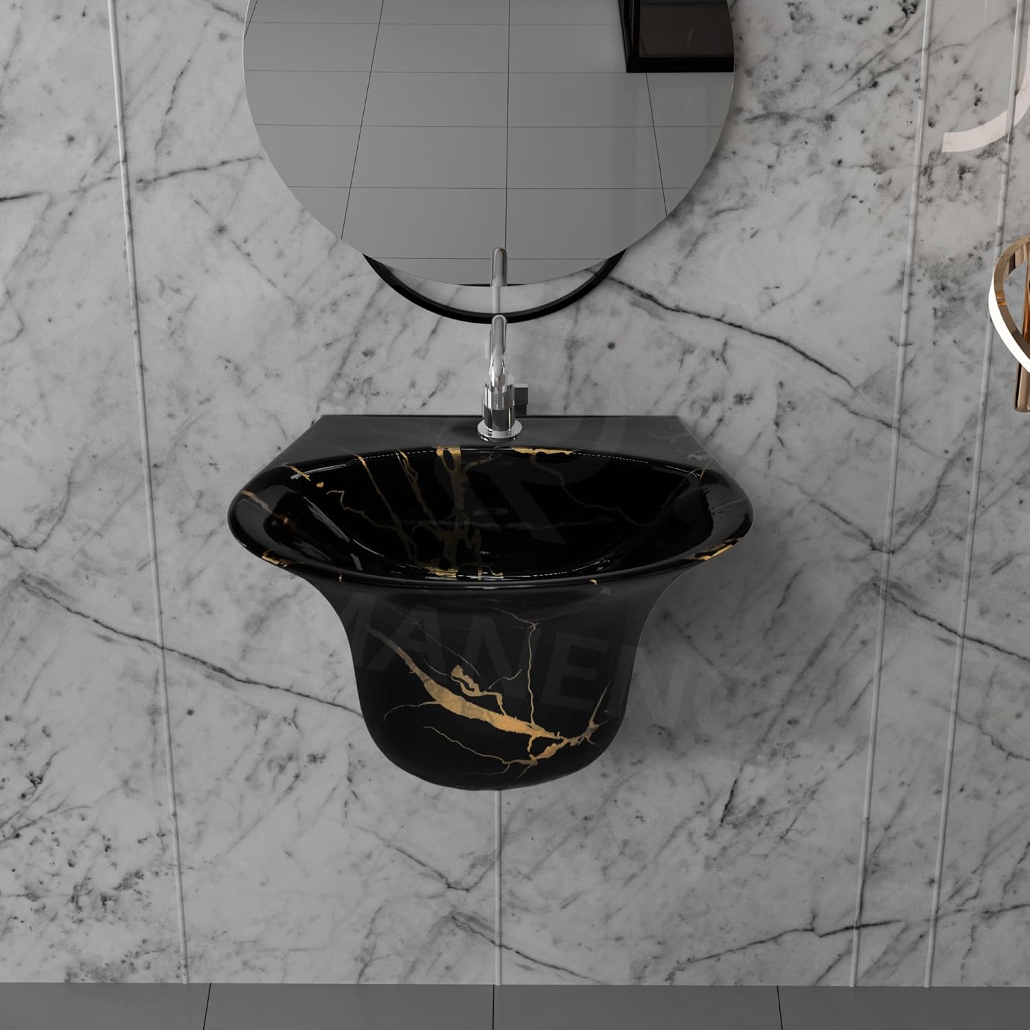 REMANENCE-RION Designer Wall Mount Half Pedestal Wash Basin for Bathroom, Restaurant, Hotels (Black Gold Jelly)