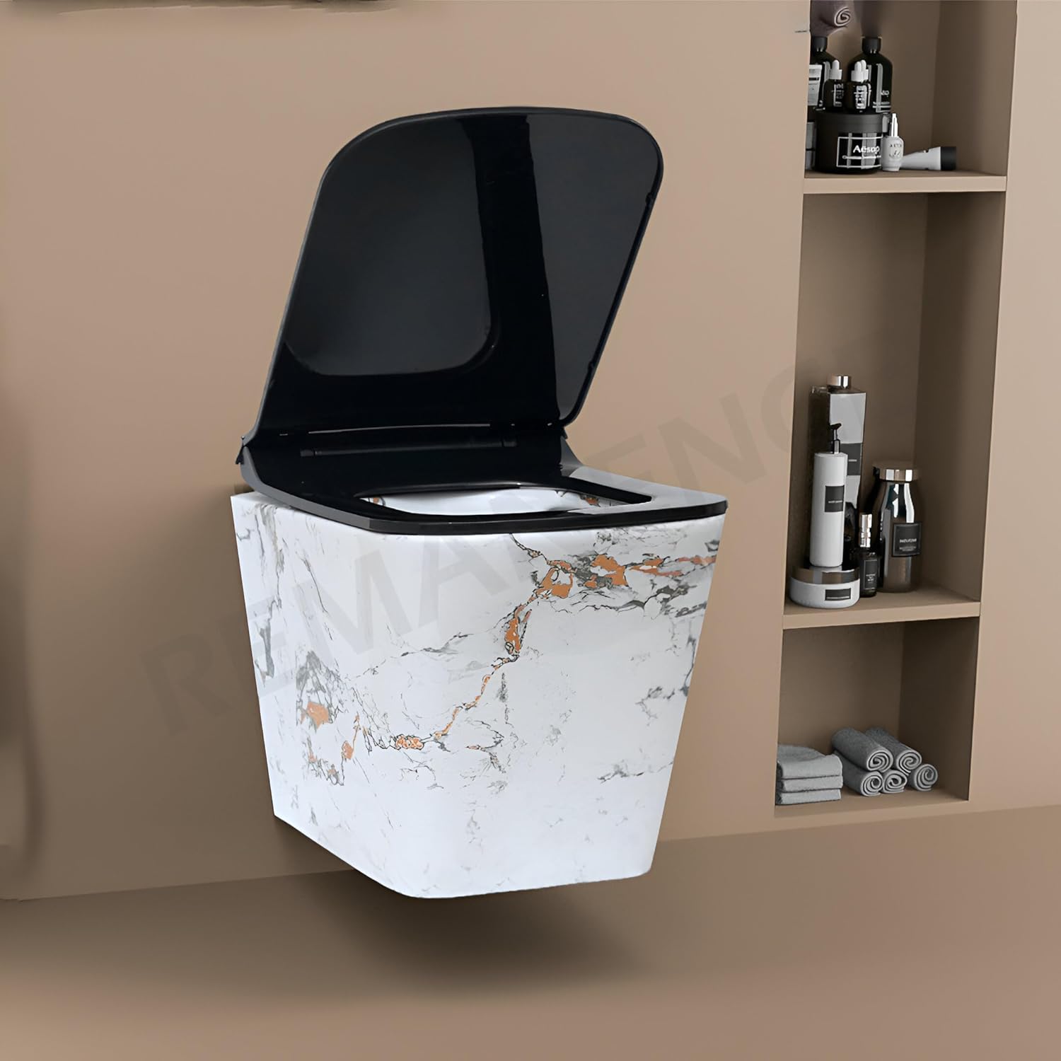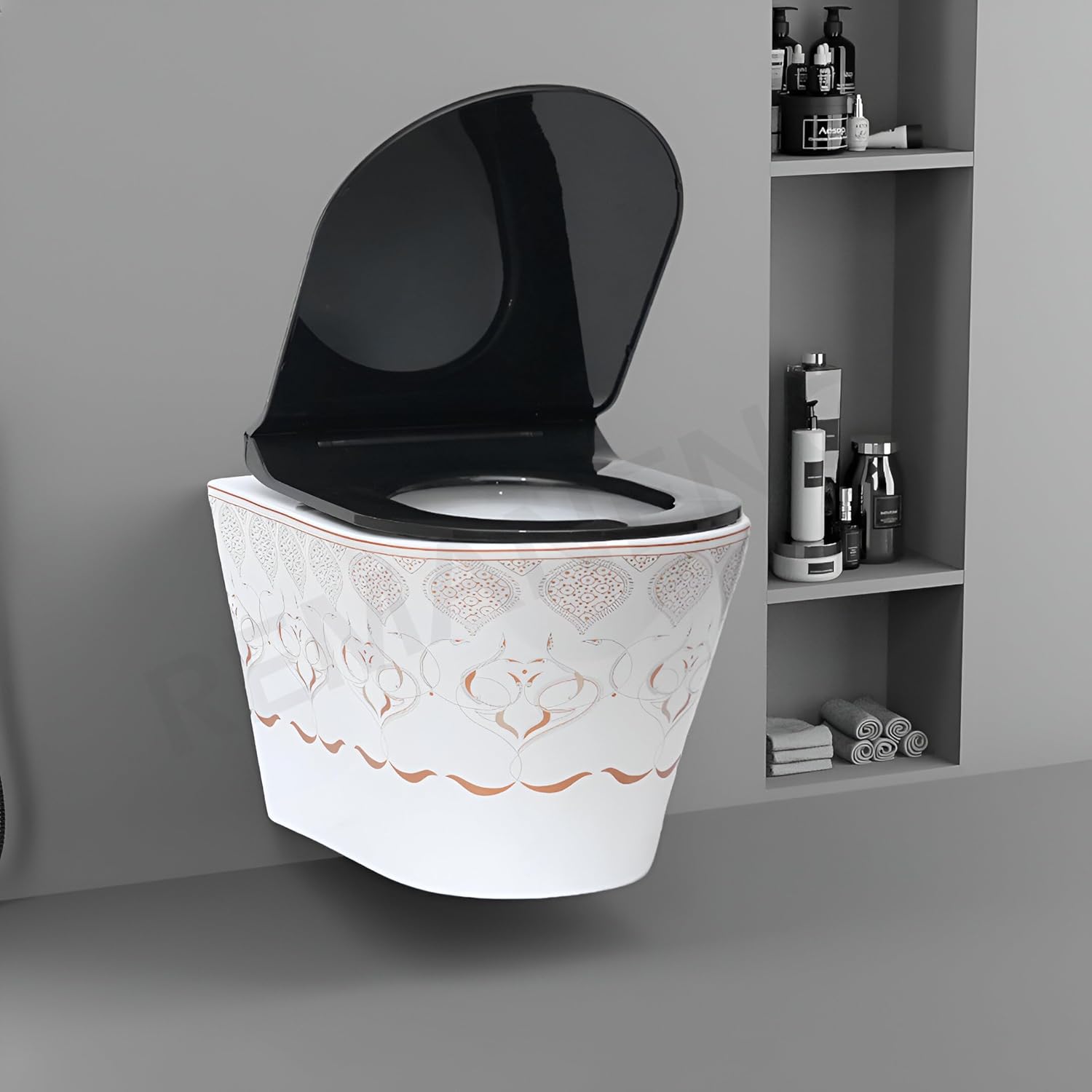 REMANENCE Ceramic Moroccan Design Wall Mount Commode with Soft Close Seat Cover (51 x 35.5 x 33.5 Centimeters)-RWH01