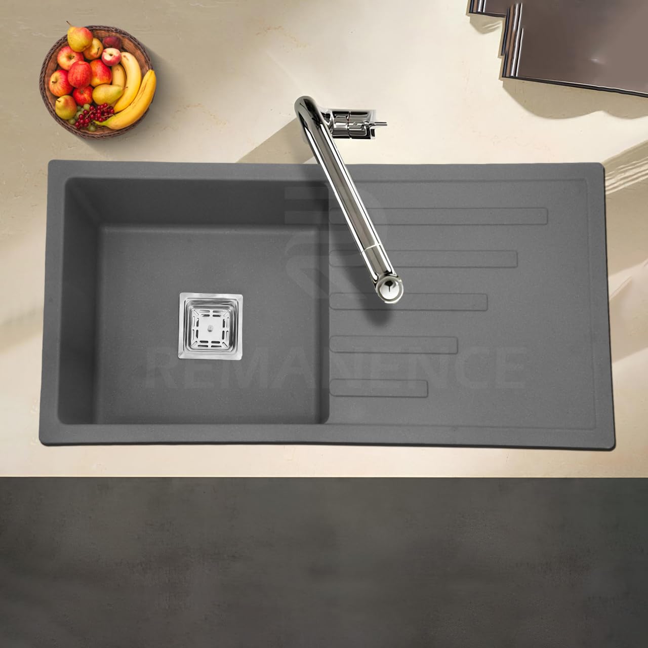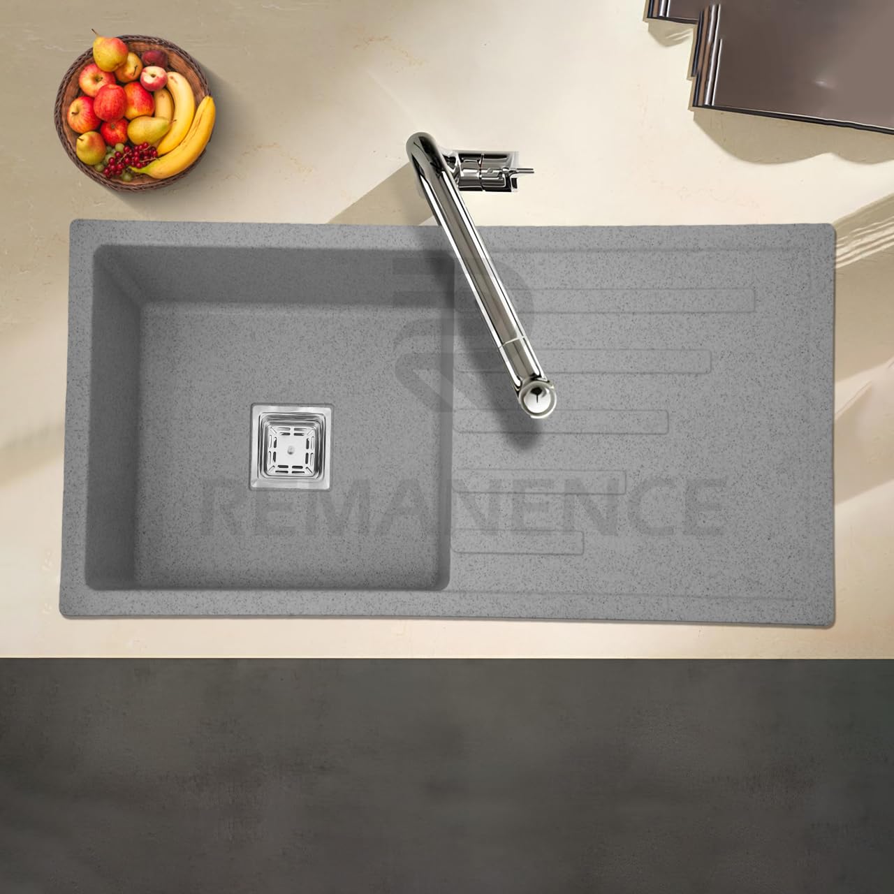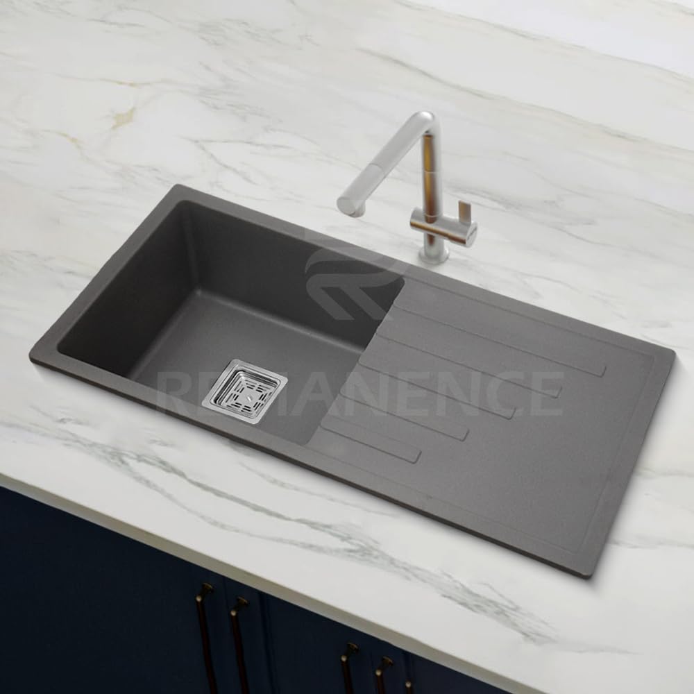 REMANENCE Granite Quartz Single Bowl Kitchen Sink With Integrated Drain Board (36 x 18 x 9 Inch) (Grey)