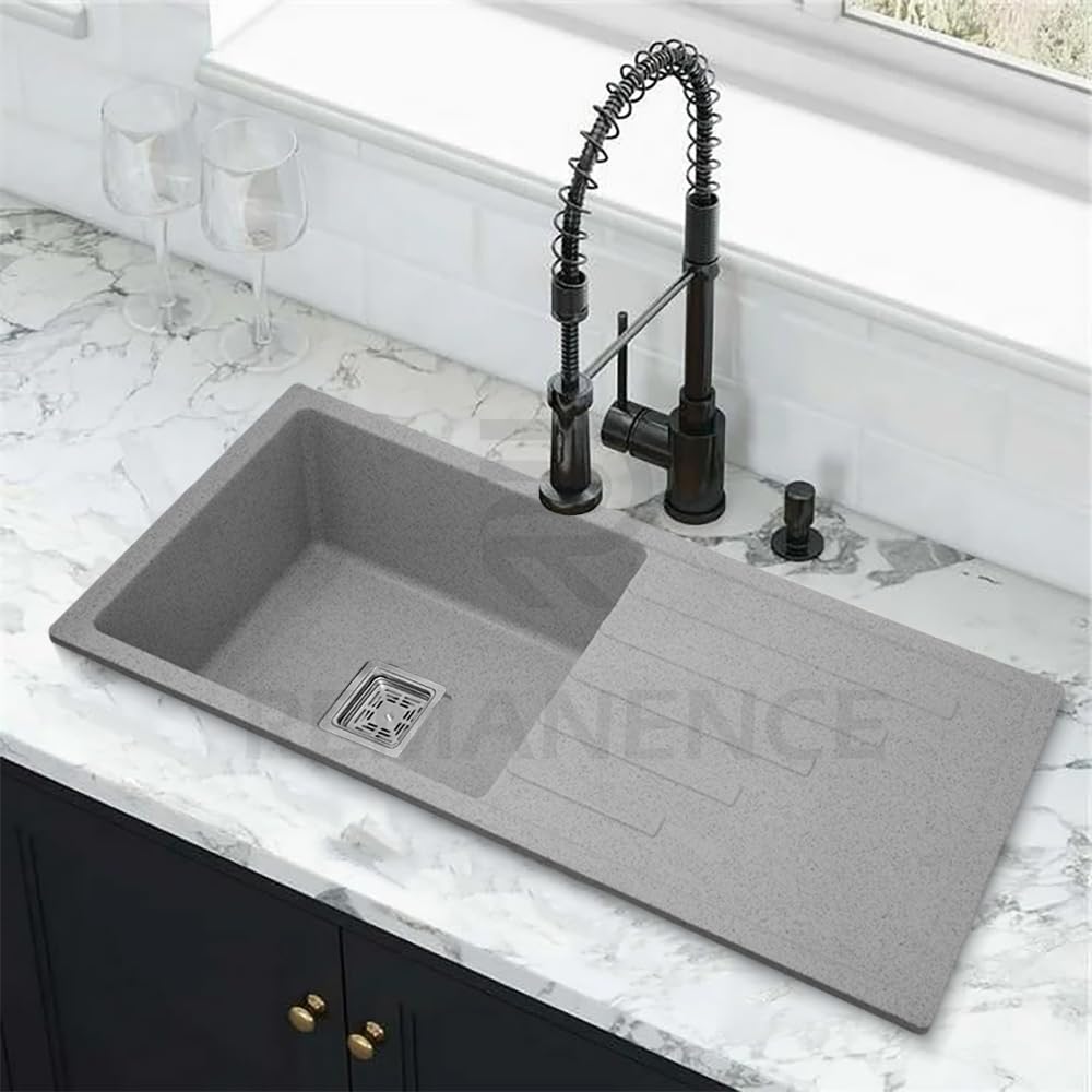 REMANENCE Granite Quartz Single Bowl Kitchen Sink With Integrated Drain Board (36 x 18 x 9 Inch) (Grey Sand)