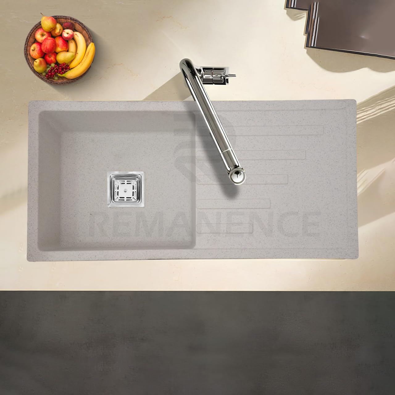 REMANENCE Granite Quartz Single Bowl Kitchen Sink With Integrated Drain Board (36 x 18 x 9 Inch) (Snow Sand)