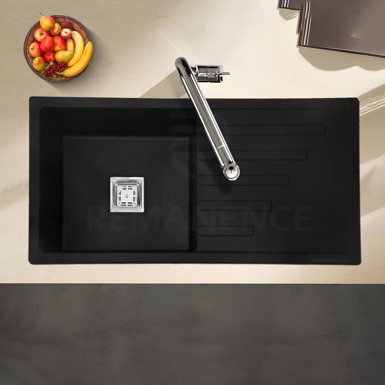 REMANENCE Granite Quartz Single Bowl Kitchen Sink With Integrated Drain Board (36 x 18 x 9 Inch) (Black)