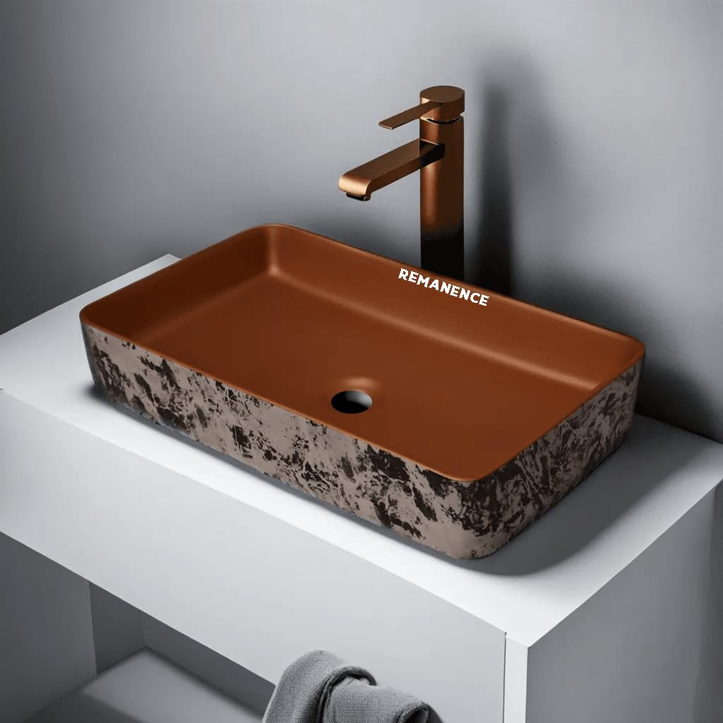 REMANENCE Designer Ceramic Table Top Wash Basin For Bathroom (24 x 14 x 5 Inch) (Matte Brown N White SL 61)