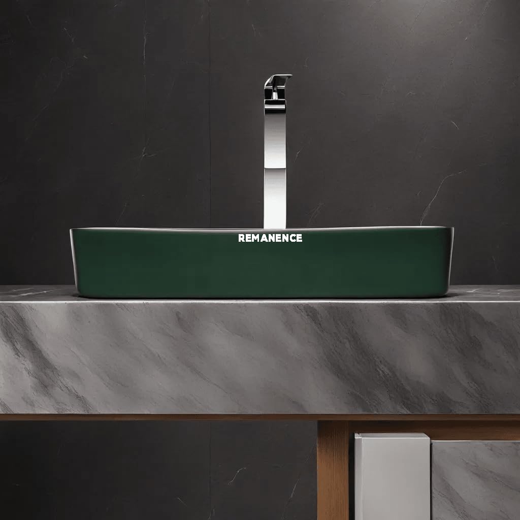 REMANENCE Designer Ceramic Table Top Wash Basin For Bathroom (24 x 14 x 5 Inch) (Deigner Matte Green Stripe SL 65)