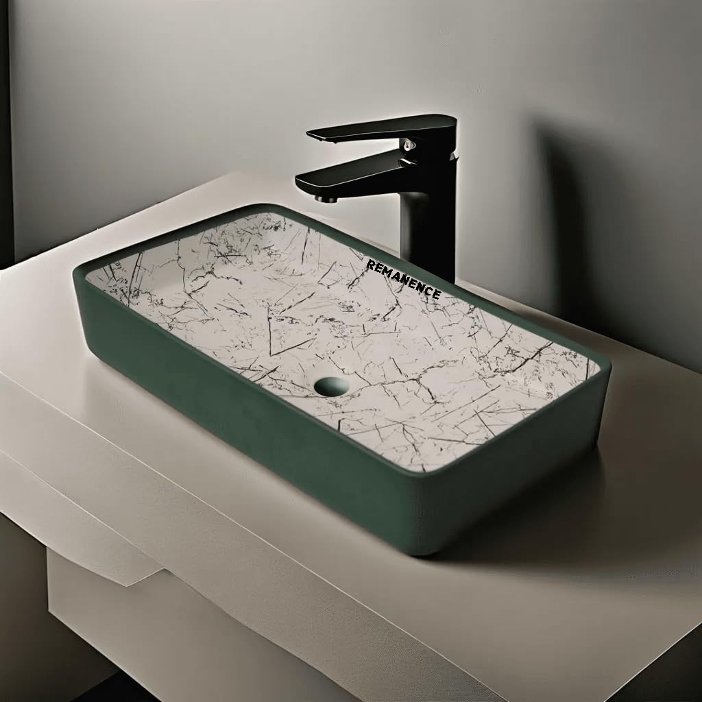 REMANENCE Designer Ceramic Table Top Wash Basin For Bathroom (24 x 14 x 5 Inch) (LightGreen N White SL 64)