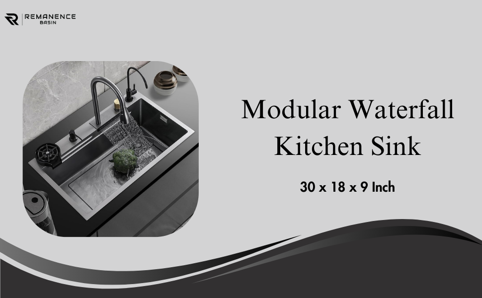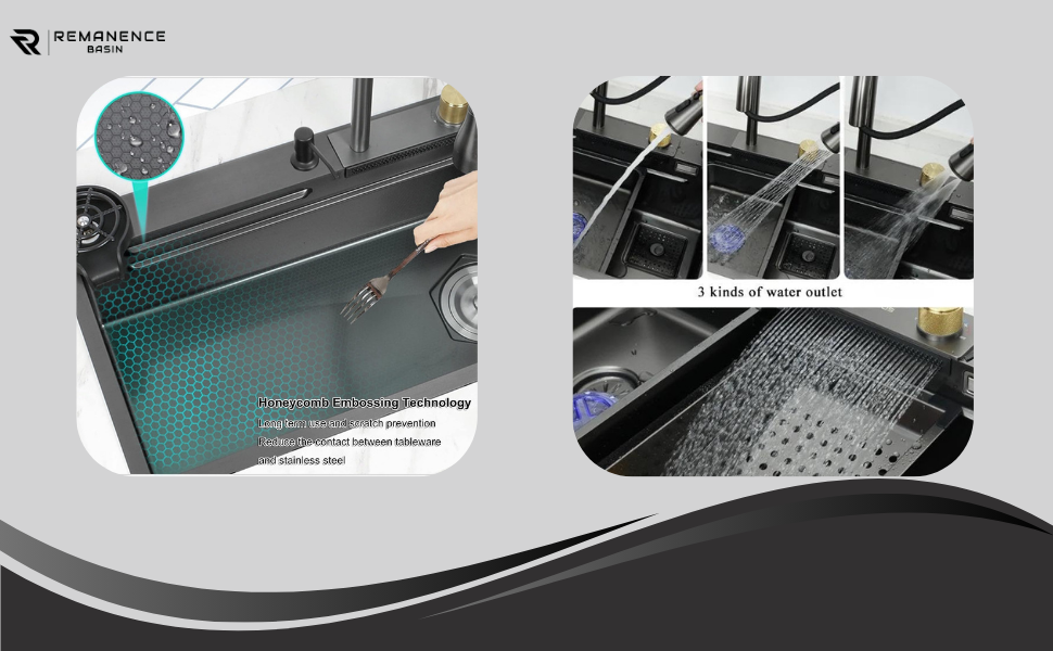 REMANENCE Modular Waterfall Kitchen Sink with Anti Scratch Honeycomb Design, Integrated and Pull-Down Faucet Set/304 Grade Stainless Steel Sink with Cup washer and Drain Baskets (30 x 18 x 9 inch)