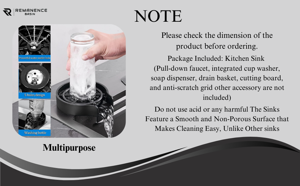 • Box Includes : Kitchen Sink + Two Stainless Steel Baskets + One Wooden Chopping Board + One Attached Waterfall And Pull Out Faucet + One Abs Soap Dispenser + RO TAP + One Cup Washer + Drain Coupling + Drain Waste Pipe + Faucet Connection Pipe